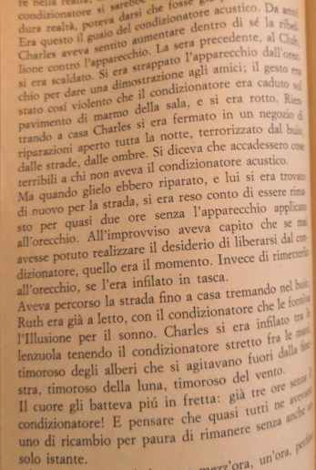 Era questo il guaio del condizionatore acustico. Da anni Charles aveva sentito aumentare dentro di sé la ribellione contro l’apparecchio. La sera precedente, al Club, si era scaldato. Si era strappato l’apparecchio dall’orecchio per dare una dimostrazione agli amici; il gesto era stato così violento che il condizionatore era caduto sul pavimento di marmo della sala, e si era rotto. Rientrando a casa Charles si era fermato in un negozio di riparazioni aperto tutta la notte, terrorizzato dal buio, dalle strade, dalle ombre. Si diceva che accadessero cose terribili a chi non aveva il condizionatore acustico. Ma quando glielo ebbero riparato, e lui si era trovato di nuovo per la strada, si era reso conto di essere rimasto per quasi due ore senza l’apparecchio applicato all’orecchio. All’improvviso aveva capito che se mai avesse potuto realizzare il desiderio di liberarsi dal condizionatore, quello era il momento. Invece di rimetterlo all’orecchio, se l’era infilato in tasca.