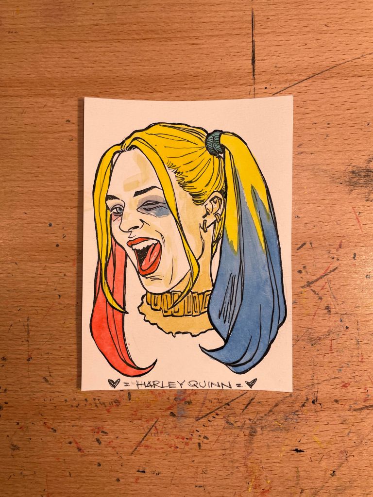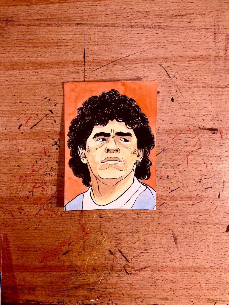 L’idea delle “figurine” (ritratti in formato “foto di una volta” 10×15) nasce da un percorso di studio per tornare a codici di disegno che era quello con cui, vent’anni fa, avevo iniziato la mia carriera di fumettista. La prima serie infatti sono disegni a matita su pezzi di fogli vari, dalla carta da cucina a semplice da fotocopia; a fine giornata lavorativa, in quel lasso di tempo di pre cena, o aperitivo se preferite, creavo questi ritratti per il puro piacere di disegnare, semplicemente. La seconda serie, quella del 2020, è decisamente più strutturata, originali inchiostrati con china e spesso colorati ad acquerello e molto legata a ciò che accadeva nel momento stesso nel quale andavo a realizzarli, da una tendenza su Twitter alla notizia da quotidiano.
