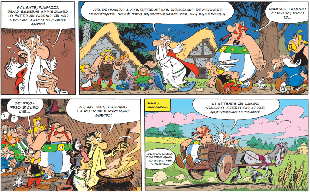 Come prevede la tradizione dell’alternanza e come conferma il druido, per la loro trentanovesima avventura, i nostri amici si preparano a fare un viaggio. Mentre i due amici si sfidano al gioco degli scacchi gallici, il druido Panoramix, che si è leggermente assopito, si sveglia di soprassalto urlando. Chi ha potuto turbare così il suo sonno e perché lo ha assalito un senso di urgenza che lo spinge ad accorrere in soccorso del misterioso personaggio?
