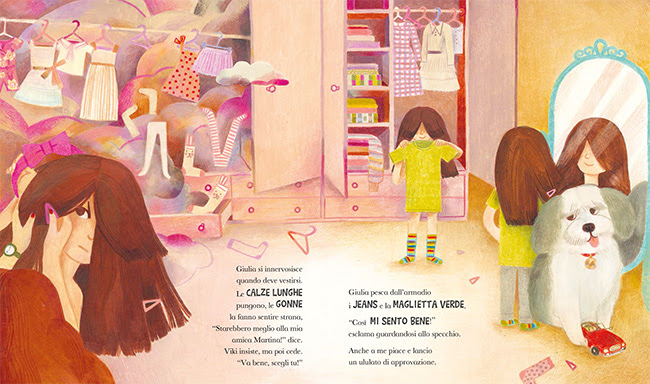 Quella che l’Orango Rosa propone nel nuovo libro della collana è la storia, scritta da Fulvia Degl’Innocenti e illustrata da Elena Pensiero, di Giulia, una bambina dalle guance rosse e dagli occhi grandi, che guardano il mondo curiosi. Giulia non ama le bambole, nè le gonne o le calze lunghe, e preferisce giocare con la sua automobilina rossa, che ha voluto a tutti i costi. Si sente molto più a suo agio indossando jeans e maglietta anziché calze lunghe che pungono e gonne che la fanno sentire strana. Quando va in piscina, vorrebbe entrare nello spogliatoio riservato ai maschi, ma Matteo e Viki, i suoi genitori, davvero non capiscono il suo comportamento.