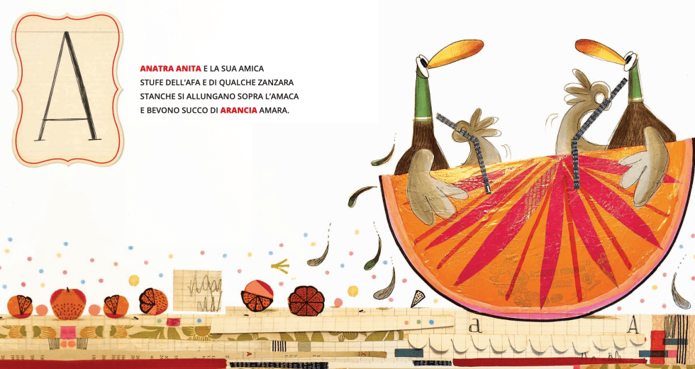 La A diventa così il pretesto per raccontare la storia dell’Anatra Anita e della sua amica, che stufe dell’afa e di qualche zanzara, si allungano sull’amaca e bevono succo di arancia.