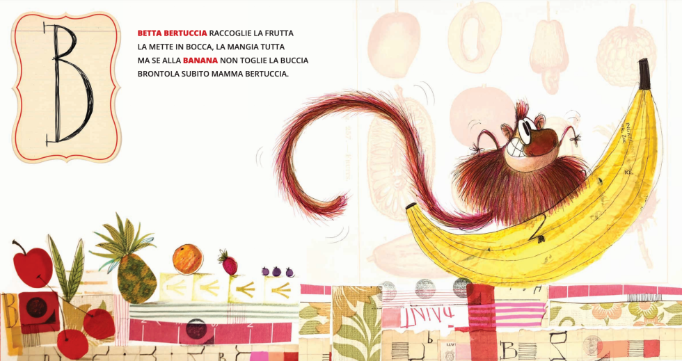 O la B, dove Betta la bertuccia raccoglie la frutta, e la lettera iniziale si ripete in banana, buccia e brontola.