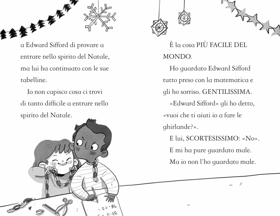 Le piace soprattutto un elfo verde e rosso, che si illumina quando gli preme la pancia. È un elfo birbone: ogni tanto, quando nessuno lo vede, le parla e le fa l’occhiolino. Ma degli elfi, si sa, non ci si deve fidare perché a volte sono proprio dispettosi! La povera Mabel, per dargli retta, si ritrova di notte ai piedi dell’albero a scartare tutti i regali. Proprio lei, a cui veniva naturale essere buonissima a Natale.