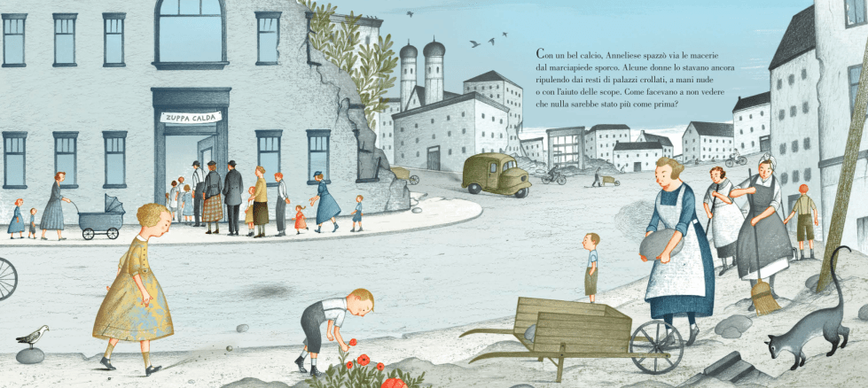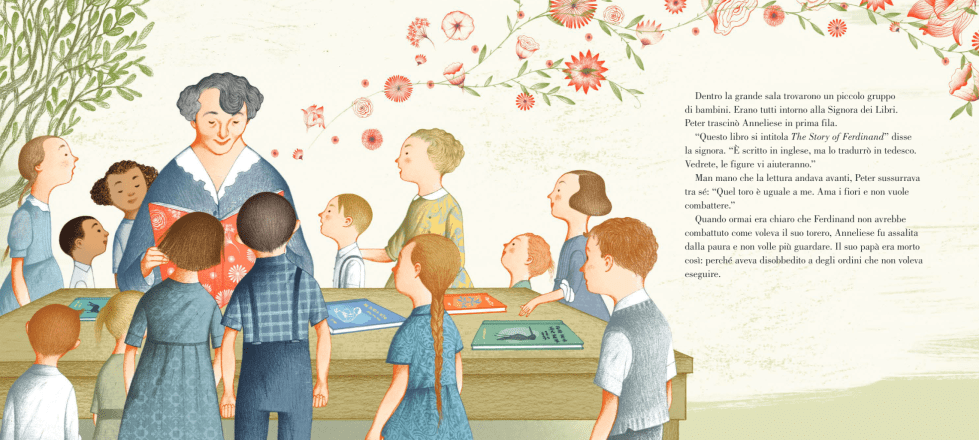 La sala che li accoglie è luminosa, piena di bambini e soprattutto di libri: più di quanti ne abbiano mai visti nella loro intera vita, più di quanti ne saprebbero contare. Alcuni sono scritti in lingue sconosciute, ma le illustrazioni lasciano immaginare un mondo di storie magnifiche. Incuriositi, i due fratelli si aggirano tra gli scaffali. Lì incontreranno la Signora dei Libri, che leggerà per loro in tedesco tutti i libri che vorranno, nutrendo il loro cuore e la loro fantasia. Quell’incontro cambierà le loro vite per sempre.
