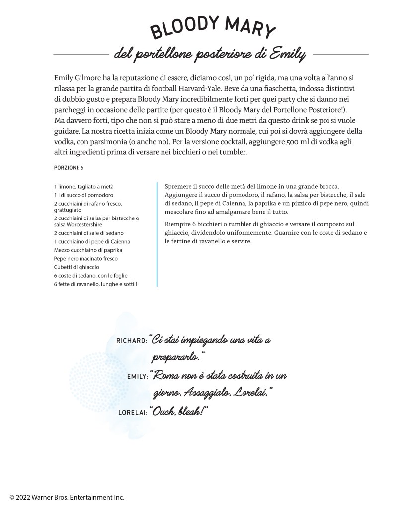 Questo ricettario è un vero e proprio viaggio attraverso l’universo culinario di Una mamma per amica. Leggendolo si avvertirà l’odore di caffè della Tavola calda di Luke, il profumo di frutta e verdura fresca che Sookie trasformava magicamente in deliziose pietanze, fino ai cocktail e pasticcini raffinati assaporati a casa di Emily e Richard.