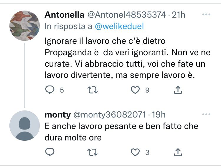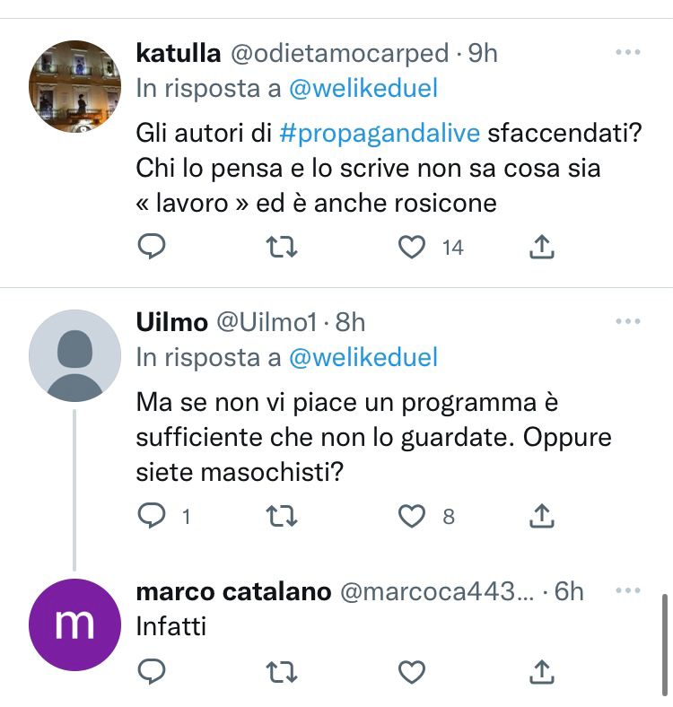 Tutto questo lo sto scrivendo perché dopo quel tweet, sui social di propaganda (e sui miei) il mondo si è diviso in tre parti: chi ha capito la battuta, chi odia la trasmissione e l’ha usata per attaccarne i protagonisti (comunisti col Rolex l’espressione più gettonata) e chi ama talmente tanto Propaganda da pensare che il mio fosse un attacco e quindi ritendendosi legittimato ad attaccare me.