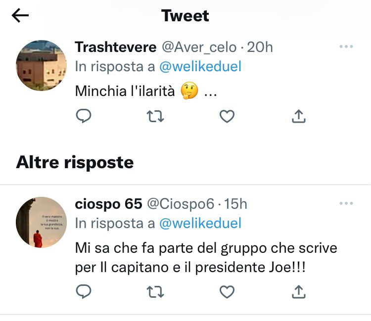 Il tweet meritevole, almeno secondo la redazione di Propaganda, di essere citato giocava sulle voci di chiusura di Twitter e al tempo stesso strizzava l’occhio in maniera bonaria (lo hanno capito anche i diretti interessati visto che mi hanno messo al primo posto) al modus operandi degli autori che prendendo molto materiale da Twitter rischierebbero di restare senza spunto e di doversi mettere a lavorare sul serio.