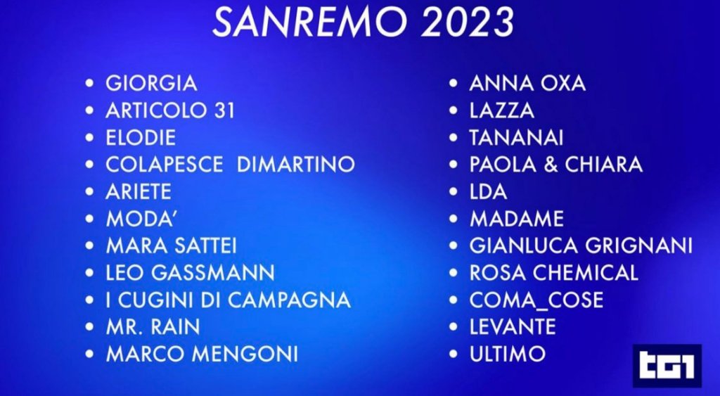 Ieri sono stati annunciati i 22 big di Sanremo. Sono bastati 30 minuti durante il tg di pranzo di domenica per farci scordare tutto: i mondiali, le crisi, il Natale in arrivo… Nulla in questi anni è polarizzante come Sanremo e le cose che gli ruotano attorno. Avremo modo di parlare a lungo del Festival, ma intanto un commento a caldo ci vuole: CI PIACE!