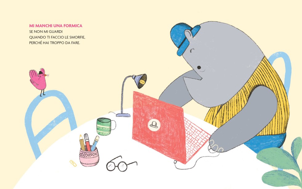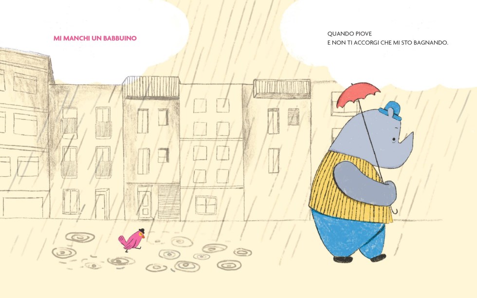E così l’uccellino appare esuberante, fa le smorfie, cerca le coccole.è pieno di tutta l’energia tipica dell’infanzia. Il rinoceronte, invece, è meno espansivo, ha giornate molto piene e non dedica alla sua amica pennuta tutte le attenzioni di cui lei avrebbe voglia.