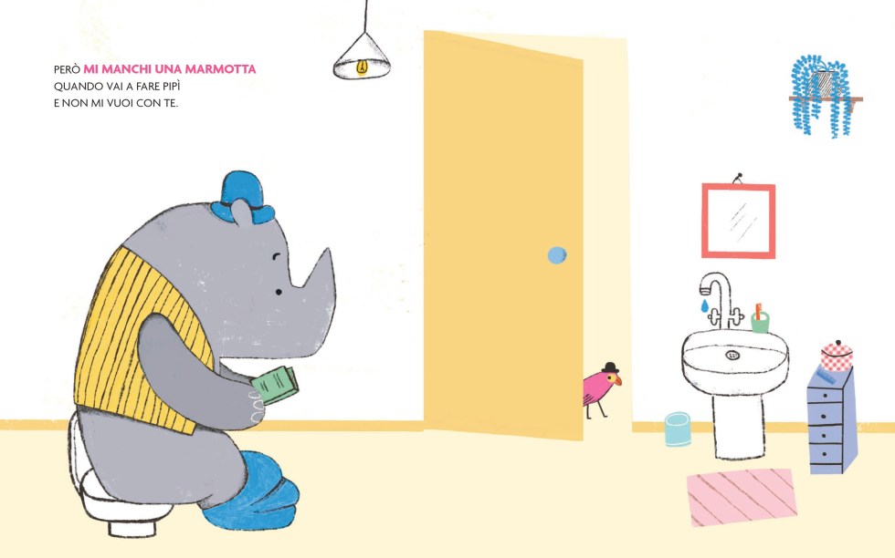 I protagonisti di questo albo in stampatello maiuscolo sono un rinoceronte e un uccellino dal becco rosso: una coppia irresistibile e improbabile al tempo stesso. I due non differiscono solo nelle dimensioni, ma anche nel carattere: l’uccellino è argento vivo, ha sempre voglia di giocare, fa le smorfie e cerca le coccole, proprio come i bambini. Il rinoceronte, invece, è posato e silenzioso.