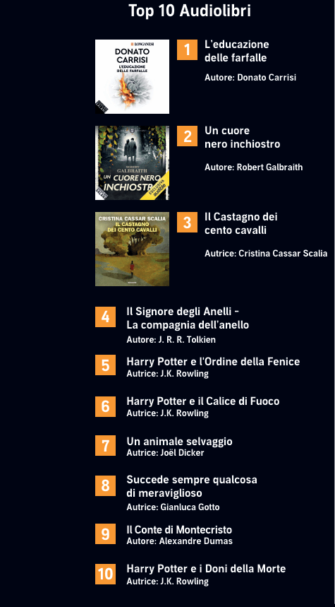 Questa mattina Audible ha reso nota la classifica dei podcast e degli audiolibri più ascoltati ad agosto. Tra gli audiolibri, oltre alle intramontabili saghe di Harry Potter e de Il signore degli anelli spiccano Donato Carrisi e Joel Dicker. Tra i podcast non stupisce il primo posto del professor Barbero, mentre le altre nove posizioni sono quasi totalmente occupate dal true crime e dai grandi fatti di cronaca del passato.